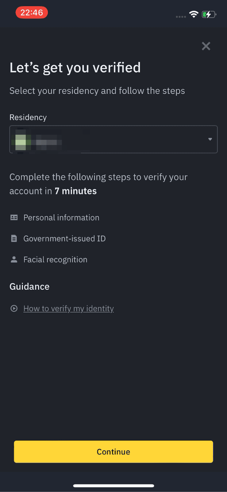 2. 选择您的居住国/地区,您将看到所在国家/地区要求完成的认证项目。然后,点击【继续】。居住国/地区必须与身份证件一致。